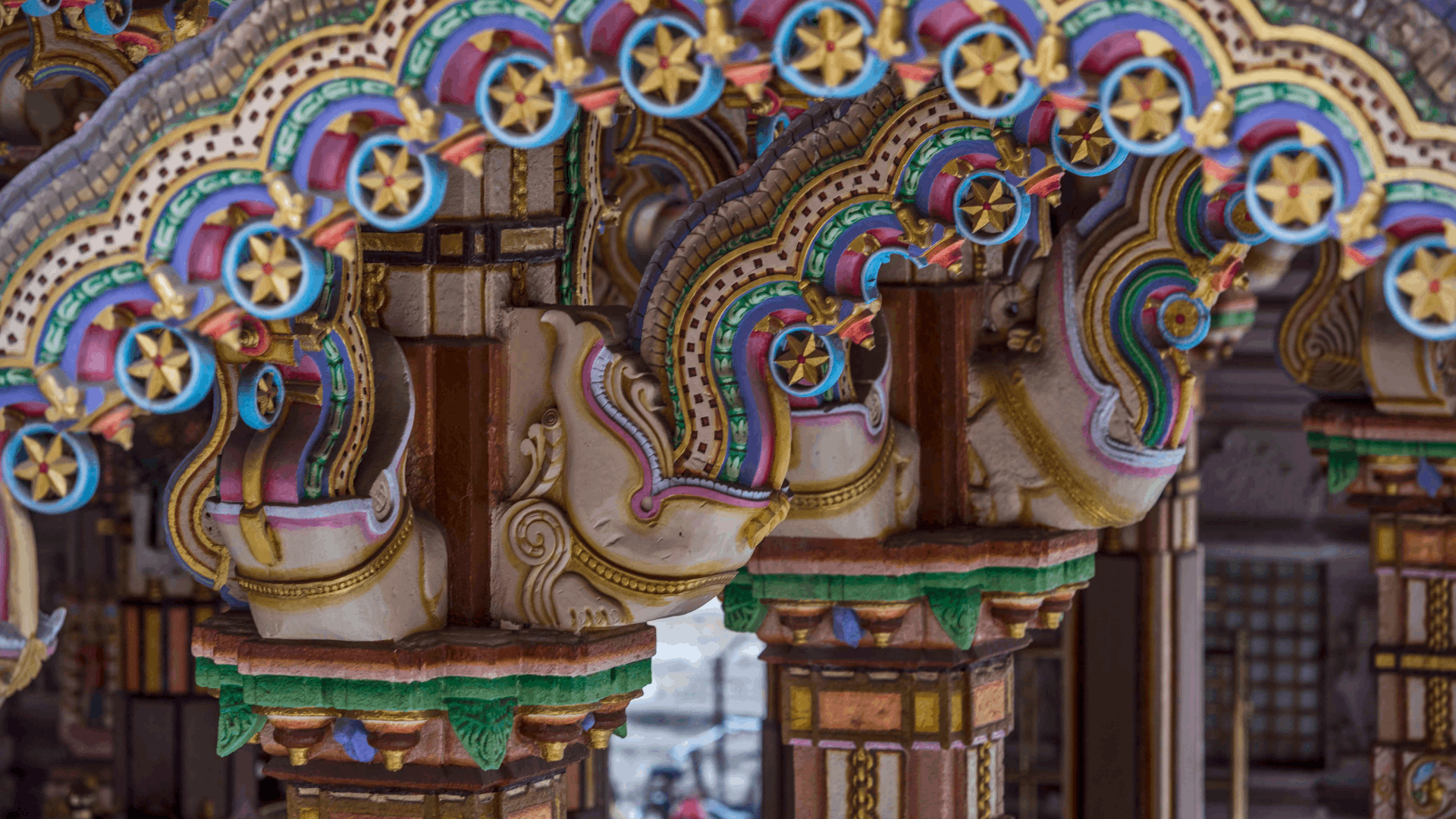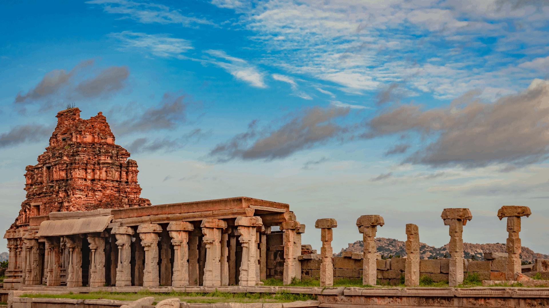 Hampi’s Vittala Temple contains 56 musical pillars (called SaReGaMa pillars after Indian classical music’s initial notes)—each main pillar surrounded by seven smaller ones producing distinct tones when tapped. The Stone Chariot’s wheels were once functional and could rotate; the government eventually cemented them to prevent damage. Look underneath for a relatively well-preserved painting, protected because it was shaded, evidence that Hampi’s sculptures were once covered in similar artwork.